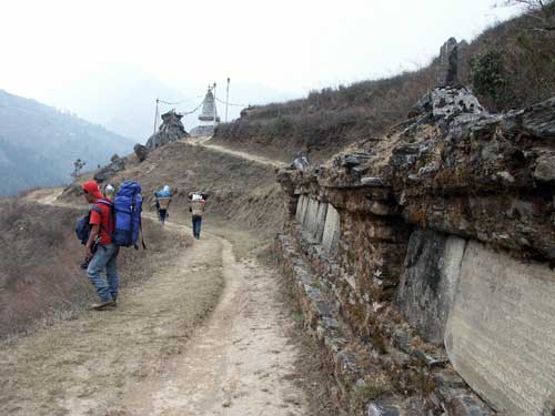 ジュンベシ村への道の途中にあったマニ石と、向こうに見えるのは四方に目のあるチョルテン(仏塔)です。手前のシェルパはニマさんで、大きな荷物を背負っているのはキッチンボーイたちです。(2004.04.01)