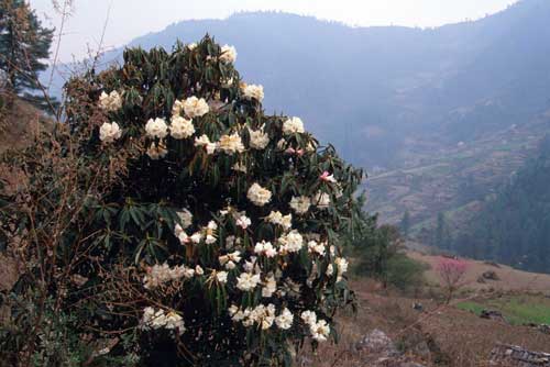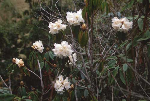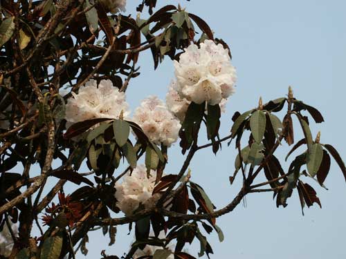 ジュンベシ村に一泊し、翌日最初に出会ったシャクナゲ(R.arboreum)です。遠くから見ると白花に見えましたが、近づくとつぼみがうっすらと色づいていました。これでは、はっきりと白花とはいえません。(2004.04.02)
