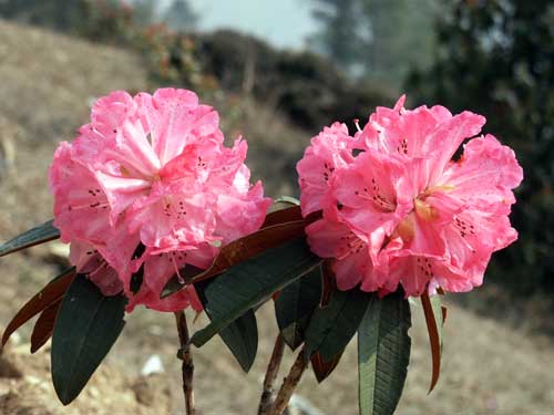 (画像サイズは26.3KB) この地方に多く見かけられたアルボレウム(R.arboreum)のピンク花です。たしかに真っ赤な花もいいですが、この柔らかい花色は、むしろ日本人好みではないかと思います。私もこの花色のほうが好きです。(2004.04.02) |