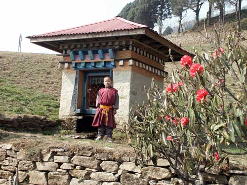 (画像サイズは22.1KB) これは大きなマニ車を水車の力でまわすものです。その前に立っているのは、ガイドのテンジさんの次男坊で、現在この近くのお寺で修行しています。もちろん、手前にある花はシャクナゲです。(2004.04.02) |