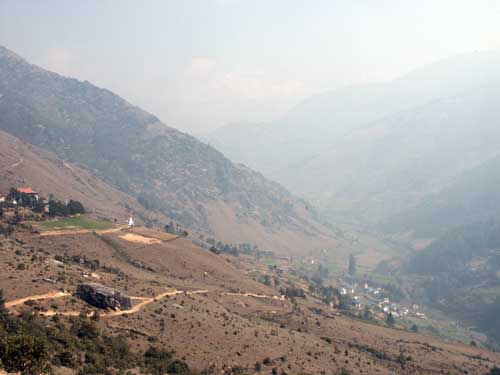 (画像サイズは33.5KB) 左手に見えるのがお寺で、谷間にあるのがズンベシ村です。その向こうにうっすらと見える雪山がヌンブール山(Numbur、6,969m)です。この山は、このあともときどき視界に入り、いつの間にか馴染みの山になりました。(2004.04.02) |