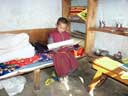 (画像サイズは12.0KB) その修行しているお寺に上ってみました。門番の犬がけたたましくほえるので、なだめてもらい、やっとのことでお堂まで進みました。この写真のように、いつも寝起きしているところでお経本も読むそうです。(2004.04.02) |
