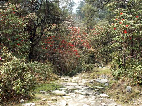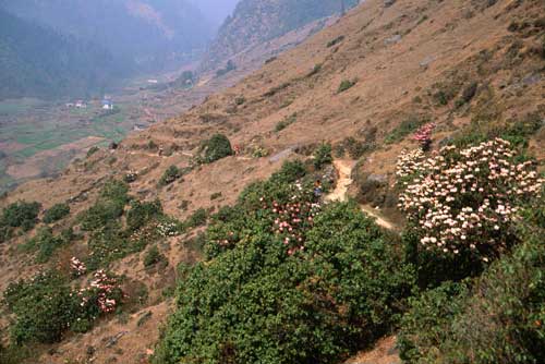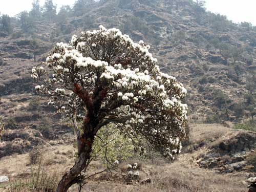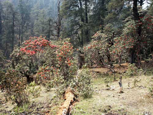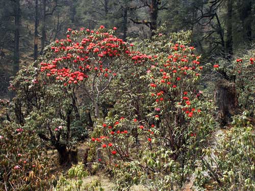 これは、2004年4月にネパールのシャクナゲ自生地を訪ねたときの写真です。ネパールには30種類のシャクナゲが確認されていますが、ネパールの国花=アルボレウム(ネパールではラリグラスといいます)はさすがに多く自生していました。そのシャクナゲ自生地は、世界でも有数の規模だと思います。しかし、その自生地が少しずつ減少しているのも事実です。