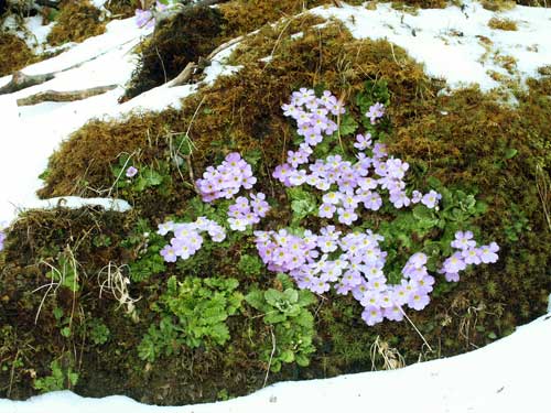 昨日の夕方に雪が降ったのですが、サクラソウの周りは融けていました。ここの草花はいつ降るかも知れない雪と戦っているのだと思うと、ちょっと応援してみたくなりました。(2004.04.03)