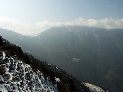 遠くで雲に隠れているのがピケ・ピークです。ここには5日に登ることにしていますが、ここから見ると相当な距離があります。この谷間の沢筋にもたくさんのシャクナゲが見えました。(2004.04.03)