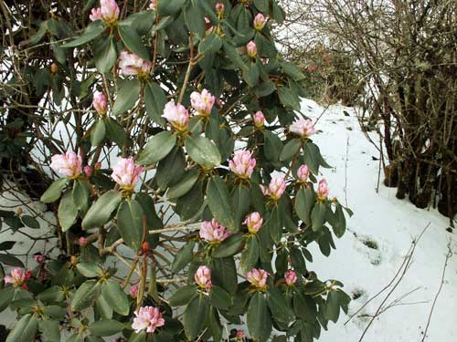 これはやっと咲き始めたカンパニュラータム(R.campanulatum)の花です。この種には芽出しが銀色っぽくでるものもありますが、この段階ではそれを確認することはできません。(2004.04.03)