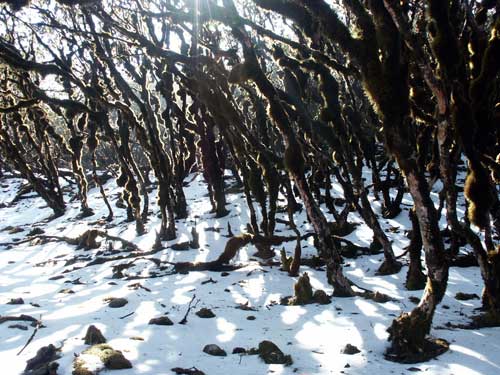 (画像サイズは46.4KB) まだ前日に降った雪が山道に残り、とても歩きにくかったのですが、太陽があたり少しずつとけだしていました。この林もシャクナゲの純林で、おそらくカンパニュラータム(R.campanulatum)ではないかと思います。(2004.04.04) |