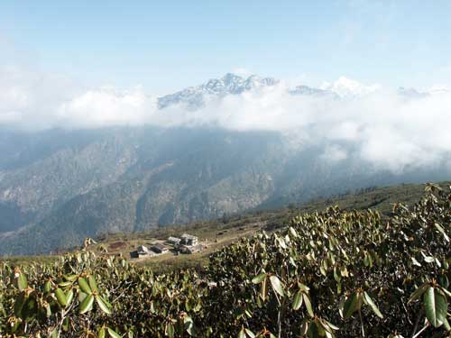 (画像サイズは27.4KB) 手前に見えるのがシャクナゲで、その向こうの開けたところにあるのがチョペルの実家です。ここから妹さんにお茶を運んできてもらったときには、びっくりしました。そしてありがたくのどの渇きを潤しました。(2004.04.04) |