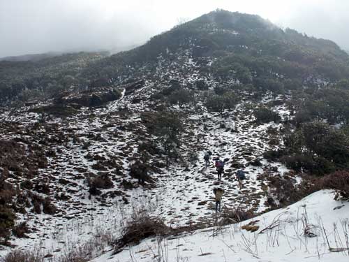 (画像サイズは38.6KB) この急な山道を荷物を背負って上っている人たちは、私たちのポーターです。足にはゴムゾーリしか履いていないのですが、それでも滑らず登り切りました。その荷物は、1人平均30Kgだそうです。(2004.04.04) |