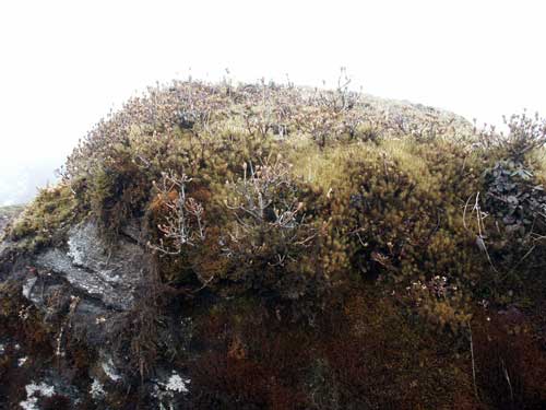 (画像サイズは29.2KB) これは岩の上にびっちり付いた苔の中に埋まるように自生していたレピドータム(R.lepidotum)です。でも、その極端に小さな葉は、とても東ネパールで見たレピドータムと同じだとすぐには信じられませんでした。(2004.04.04) |