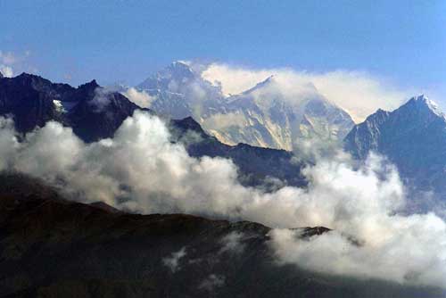 (画像サイズは13.5KB) ピケ・イースト頂上から見たもので、中央の高いのがエベレスト(標高8,848m)で、その右にローチェ(8,501m)が見えます。「ロー」とはシェルパ語で南を意味し、「チェ」は岳という言葉だそうです。(2004.04.05) |
