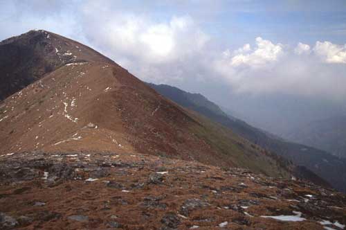 (画像サイズは17.0KB) ピケ・イーストからピケ・ウエストを見たところです。まったく不思議なことですが、片一方の斜面にはほとんどシャクナゲの株はありません。この写真を見れば一目瞭然です。(2004.04.05) |