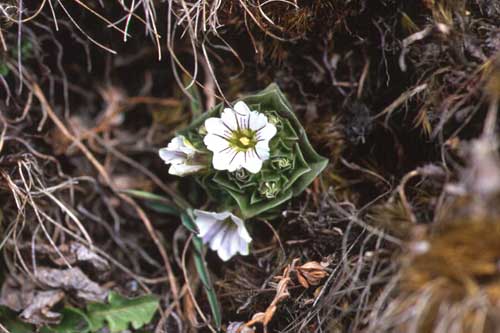 (画像サイズは27.4KB) ピケ・ウエスト付近の草場で見つけたリンドウで、その葉に包まれるように花を付けていました。この付近には少しありましたが、ここより下がったところにはほとんどありませんでした。(2004.04.05) |