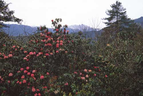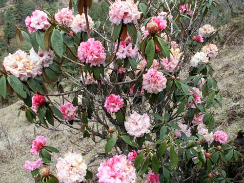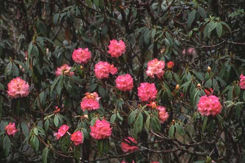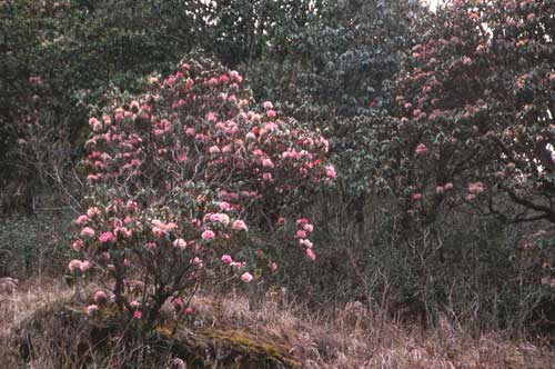 (画像サイズは28.3KB) 夢の中に八重咲きアルボレウムがなんども出てきたので、ここに居ては夢でもなんでもないので、もう一度、一人で会いに行きました。途中で出会ったシャクナゲたちは、昨夜の雨で少し傷んでいました。(2004.04.07) |