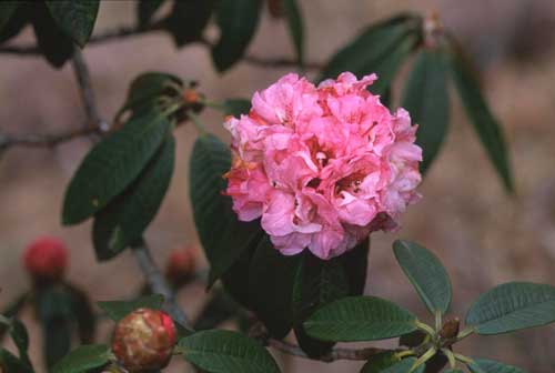 (画像サイズは31.0KB) これも途中で出会ったアルボレウムですが、バラ色とでもいえるような照りのある花色が印象的です。木もツンツンと伸びるようなタイプではないので、園芸価値はありそうです。(2004.04.07) |