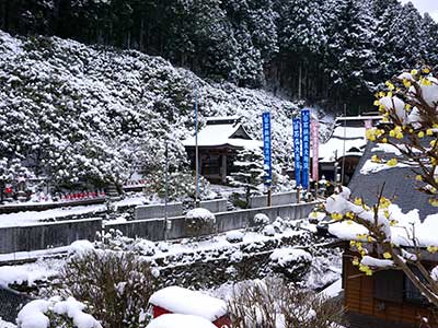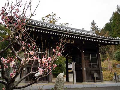 それから納経所に行くと、この裏手に弥勒堂があり、そこには五百羅漢がおまつりされているということを聞き、そこもお詣りすることにしました。裏手に回ると、盆栽にでもできそうな大きなウメの古木が並木をつくっていて、一部は花も咲いていました。そこを進むと石段があり、上りきるとその正面に弥勒堂がありました。