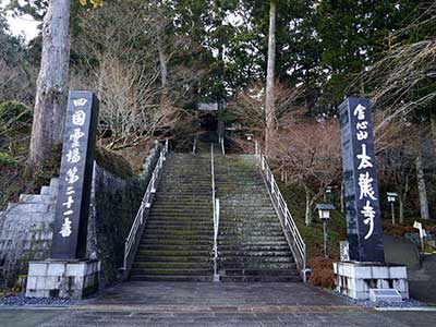 第4番札所大日寺は、県道12号線を西に向かって進み、羅漢タクシーのところの信号を右折し、徳島自動車道の下をくぐり、さらに進んだ突き当たりにあります。