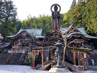 大師堂の前には、ヒカンザクラが咲いていて、とても明るい雰囲気です。お堂の左側には修行大師尊像が建ち、こじんまりとしたお堂に沿うようなお姿です。