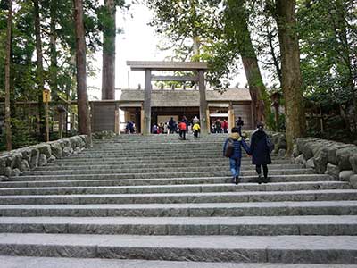 そして、宇治橋から入り、神苑を通り、そして正宮へと進み、参拝しました。左の写真は、その内宮正宮の石段の前で撮ったものです。